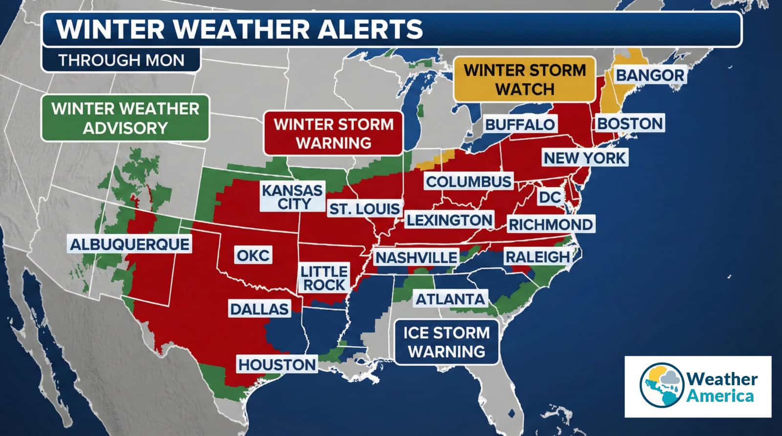 Northeast (main impact zone): New York (including NYC), New Jersey, Pennsylvania, Connecticut, Massachusetts (including Boston), and parts of New England. The heaviest snow is expected in inland areas, while coastal regions may receive less snow but more sleet and ice.